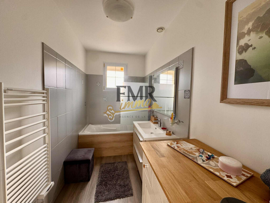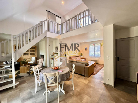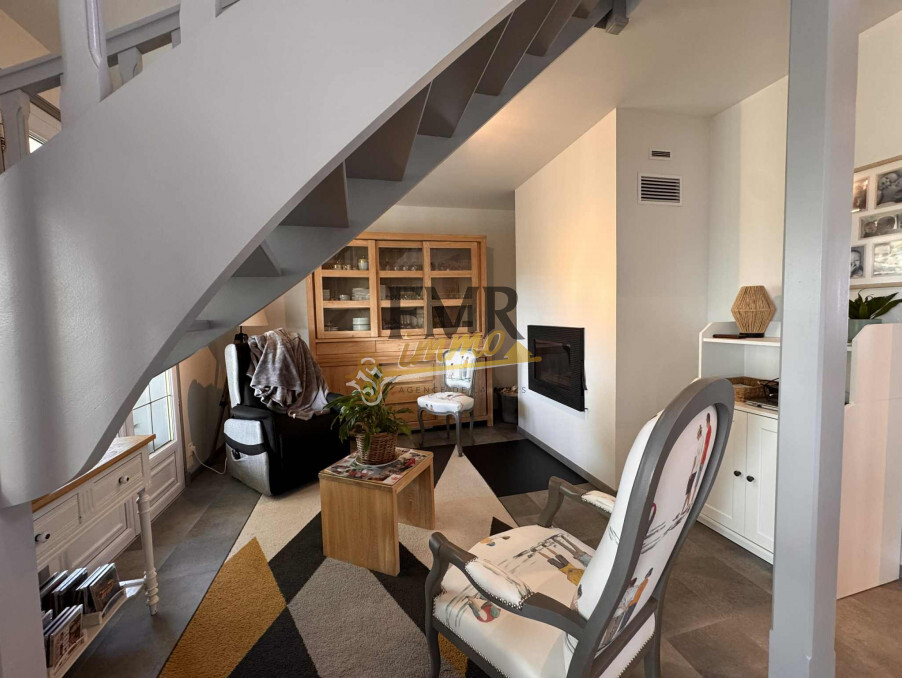 Elle se compose d’un vaste salon-séjour lumineux avec cheminée insert et plafond cathédrale, d’une cuisine indépendante, de deux salles d’eau ainsi que d’une chambre de plain-pied.