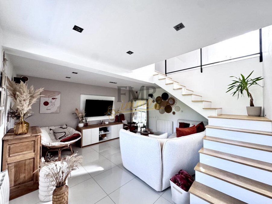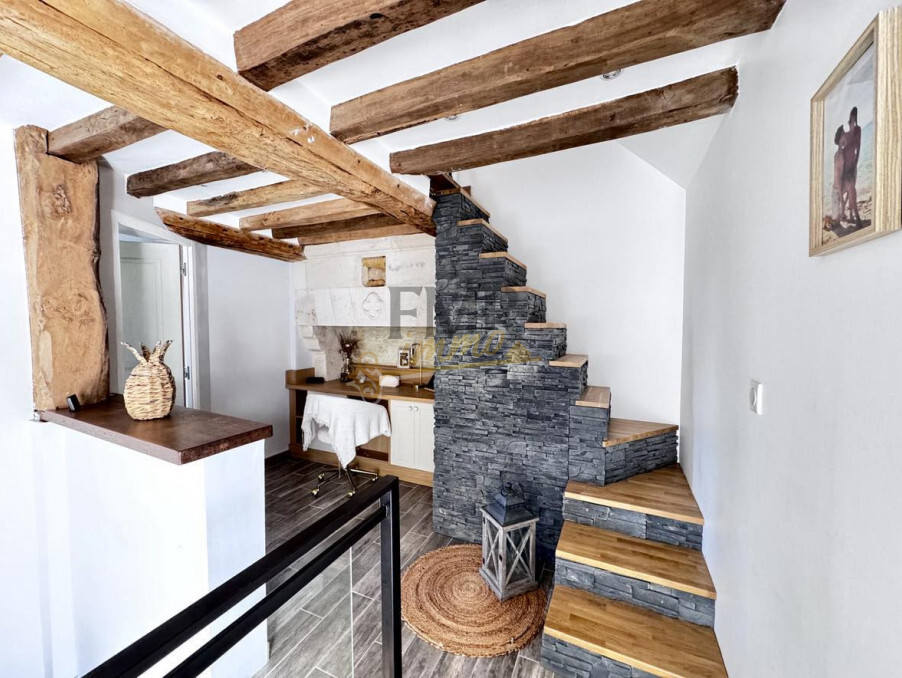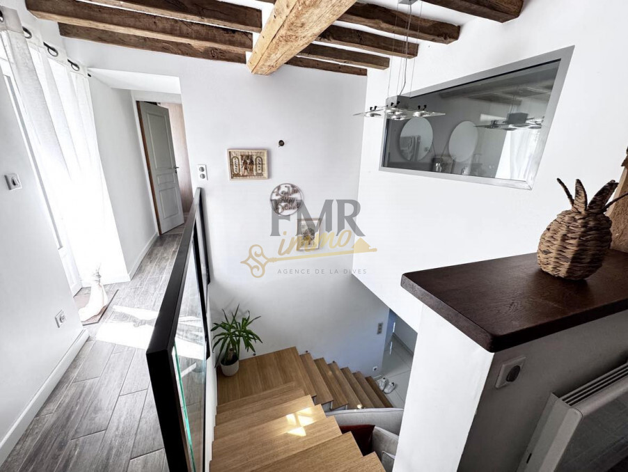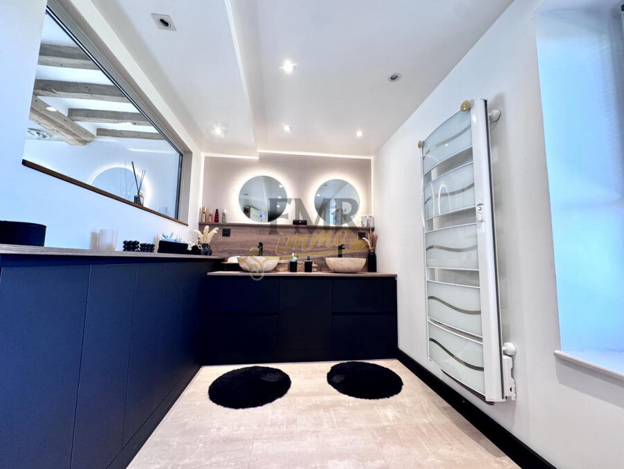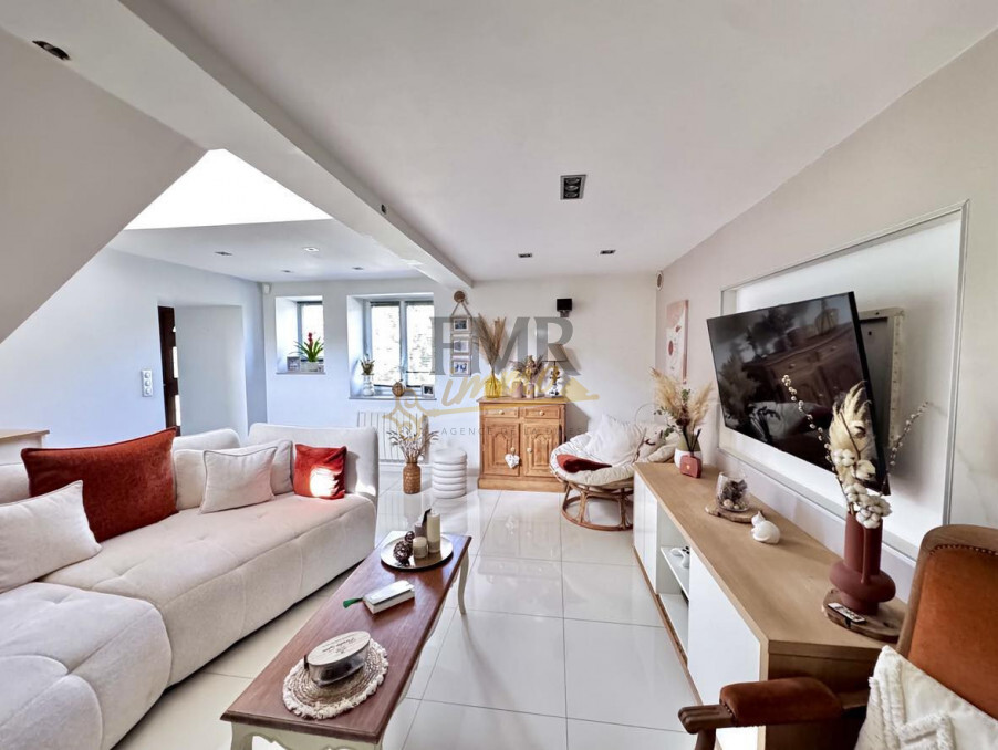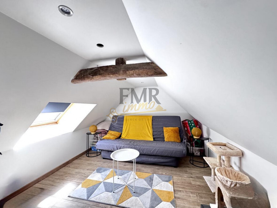 Cette maison comprend : un salon / séjour, une cuisine aménagée et équipée, un WC et une buanderie au rdc. Un palier, une grande chambre, une salle de douche avec double vasques et un joli jardin au 1er étage. Deux pièces sous combles aménagée. Un garage attenant à l'extérieure.